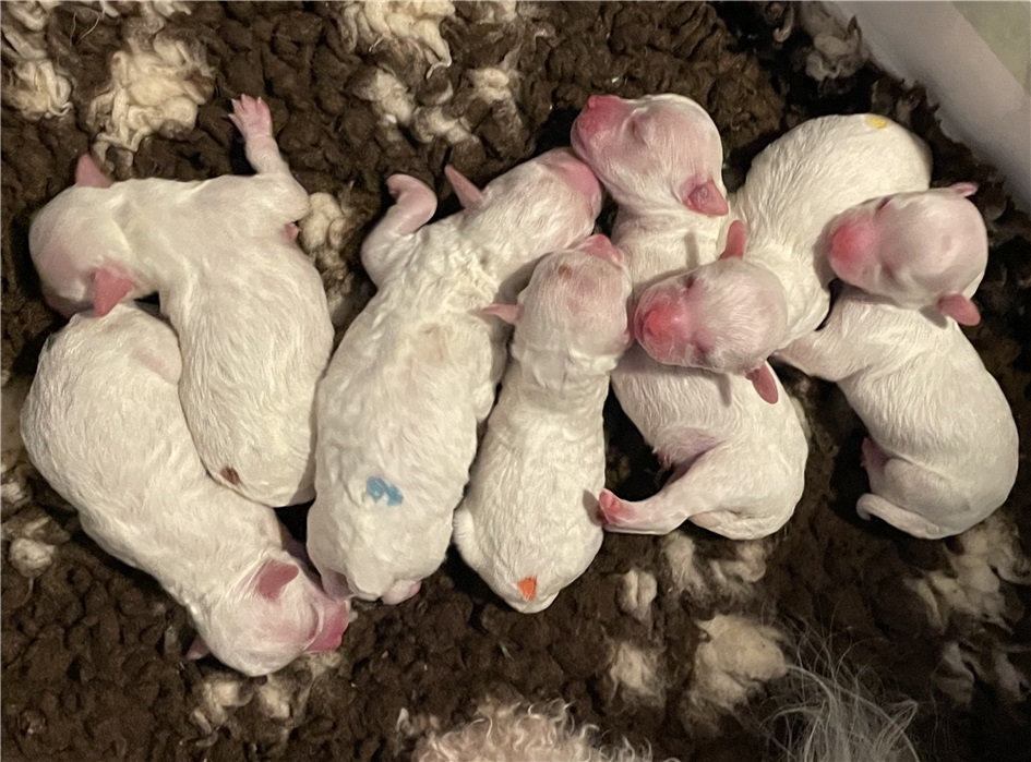 Onsdag ville Kaya ikke spise, og i løbet af natten skulle hun ud eller bare gå lidt småklynkende omkring cirka en gang i timen. Ellers var hun ganske rolig. Ved 5.30-tiden kastede hun op, men faldt til ro igen. 8.30 fik hun et par lette presseveer - og allerede 9.10 kom første hvalp. To timer og ti minutter senere lå der syv sunde drenge i fødekassen. En utroligt let og ukompliceret fødsel for en førstegangsmor.